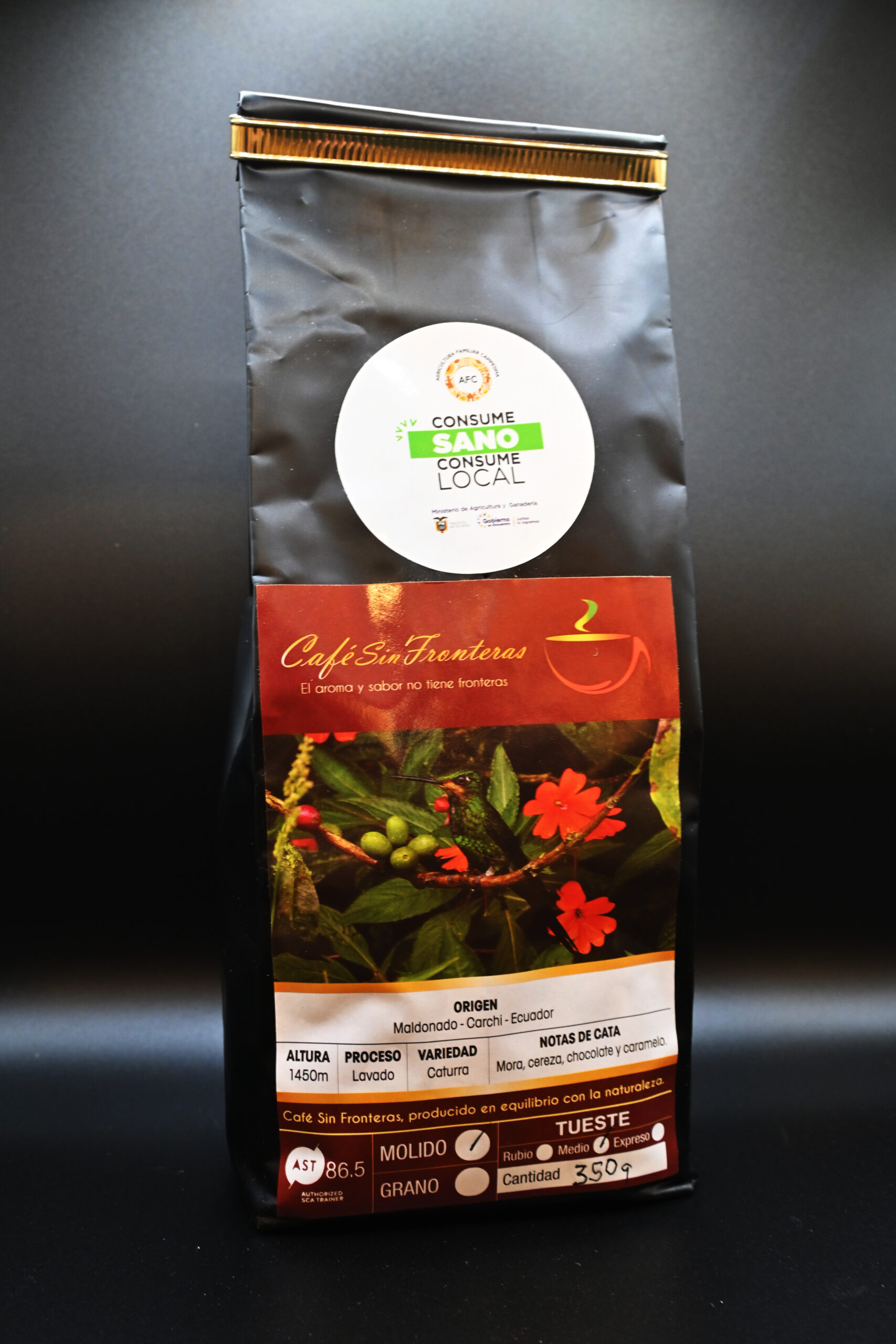 Granos de café selecionado, clasificado, secado, fermentado, tostado y en molido. Presentación 350g, 450g