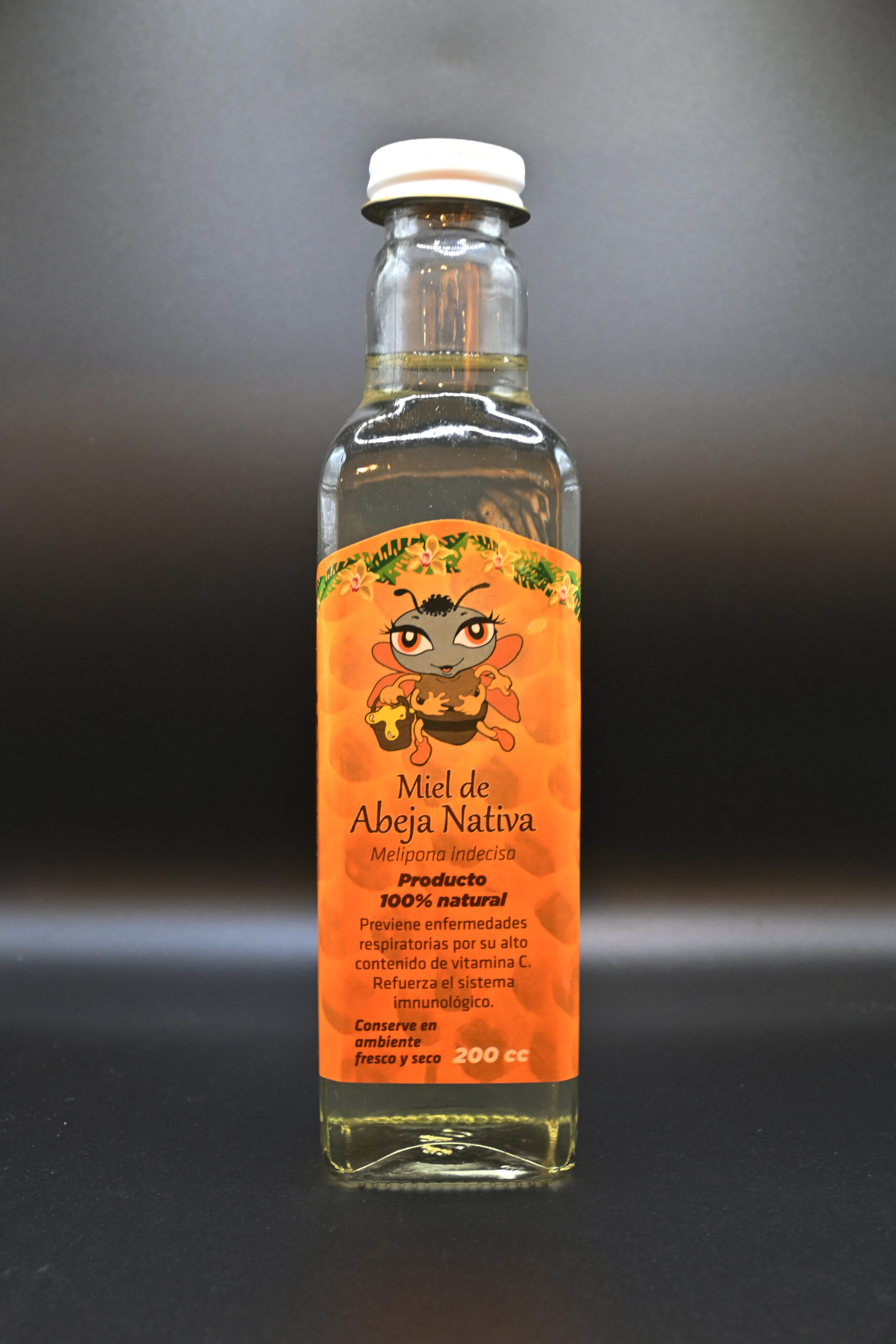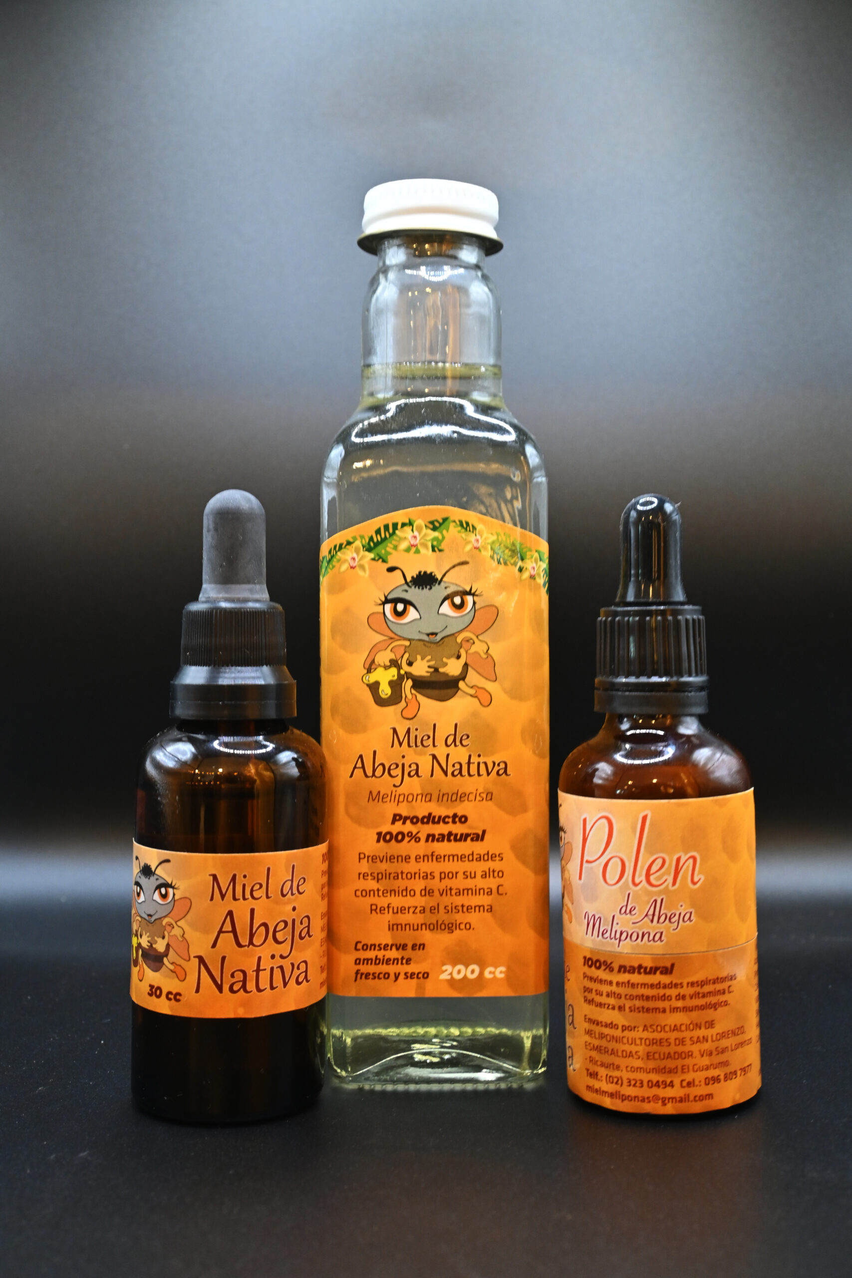 miel de abeja nativa melipona, sin aguijon de bosques nativos de comunidades de Esmeraldas. Presentación 100ml, 250ml, 500ml, 1lt